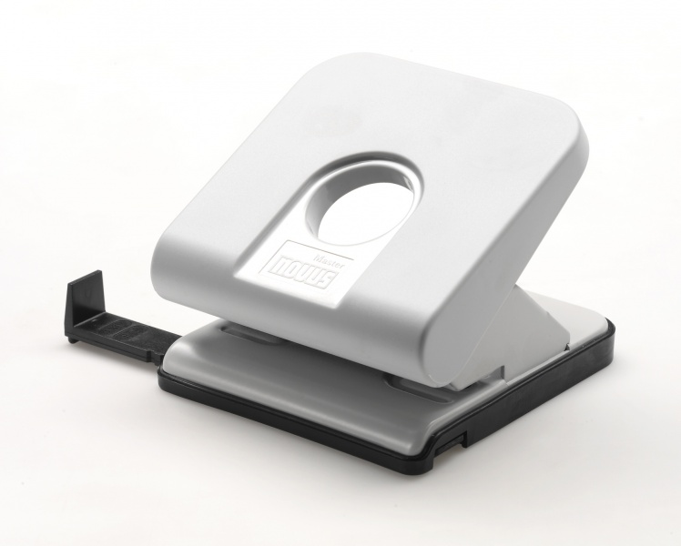 Kancelářská děrovačka, vybavena posuvným pravítkem, designově vhodná k sešívačce Novus Stabil, kapacita 25 listů
