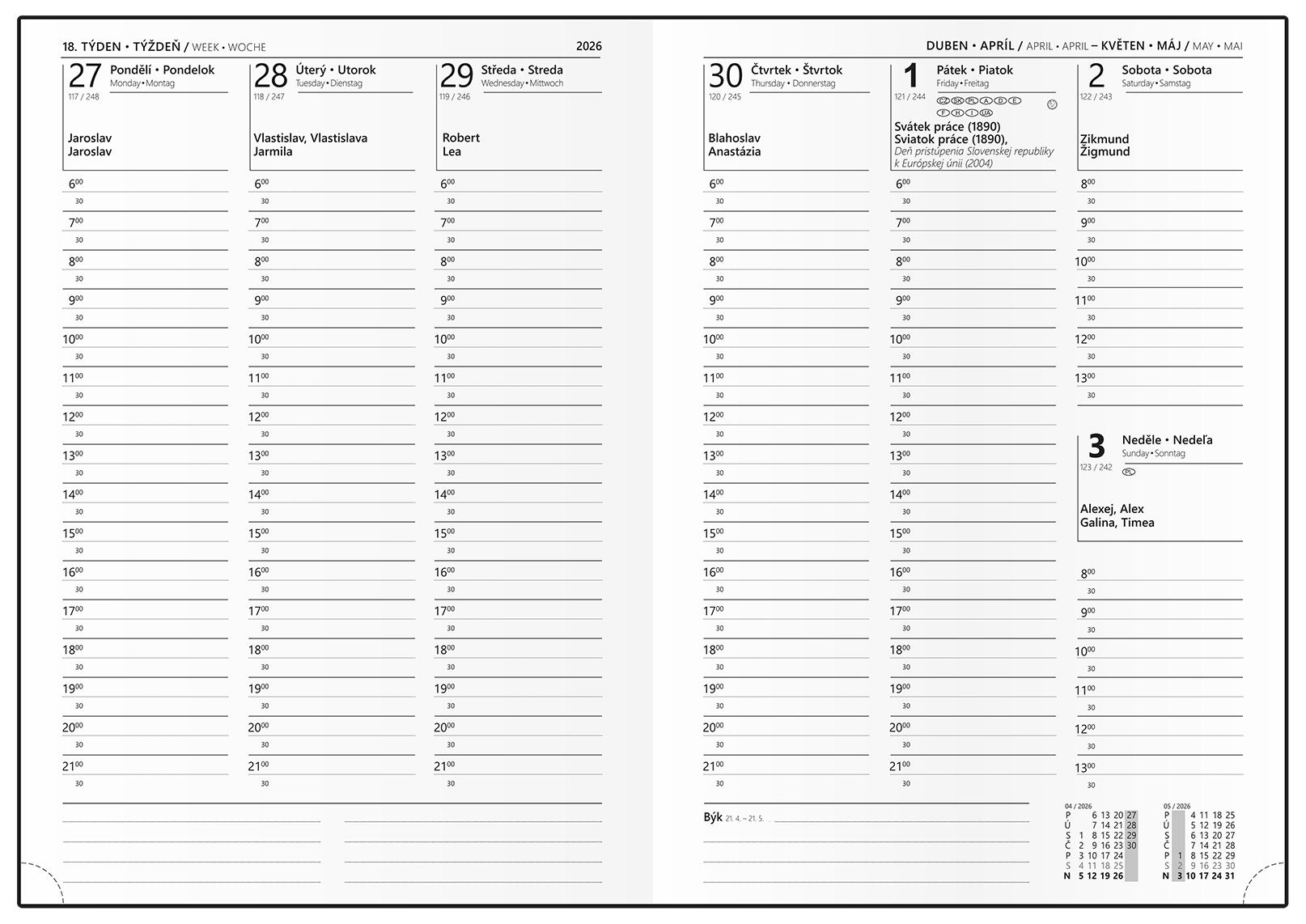 200x280mm (A4), týdenní plánování, 144 stran. • jemný hladký materiál s matným povrchem • ražba roku • oboustranná pěnová výplň desek • rovný hřbet • kapitálky a stužka • možnosti potisku: ražba, sítotisk, ražba přes pásku Kalendárium: • české jmenné • měsíční fáze • roční období • letní a zimní čas • dny a měsíce ve 4 jazycích: CZ, SK, ANG, D Informační stránky obsahují: • osobní záznamy • tabulkový kalendář • měsíční termíny • plán dovolených • plánovací kalendář • mezinárodní svátky • místo na poznámky