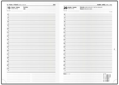 Rozměry: 143x205 , 384 stran. • jemný hladký materiál • ražba roku • jednoduché obšití po obvodu desky diáře • jednostranná pěnová výplň desky • kapitálky a stužka • rovný hřbet Informační stránky obsahují: • osobní záznamy • tabulkový kalendář • plánovací kalendář • místo na poznámky • i soboty i neděle jsou na každé stránce zvlášť • časové rozmezí: 6:00 - 22:00 hodin • přední předsádka: mapa ČR • zadní předsádka: mapa Evropy kalendárium: • české jmenné • měsíční fáze • roční období • letní a zimní čas • dny a měsíce v 4 jazycích: CZ, SK, ANG, D • mezinárodní svátky