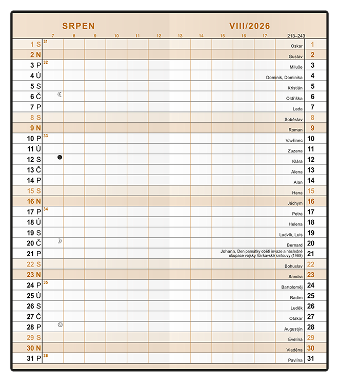 79 x 179 mm, 32 stran Tištěná grafika potažená matným laminem, šitá vazba V1, transparentní obalofset, 70g/m2 Kalendárium: české měsíční jmenné, měsíční fáze, roční období, letní a zimní čas. Jednoduchý a praktický měsíční diář vyrobený z jemného hladkého materiálu s polomatným povrchem. Ideální pro každého, kdo si oblíbil měkkou šitou vazbu.