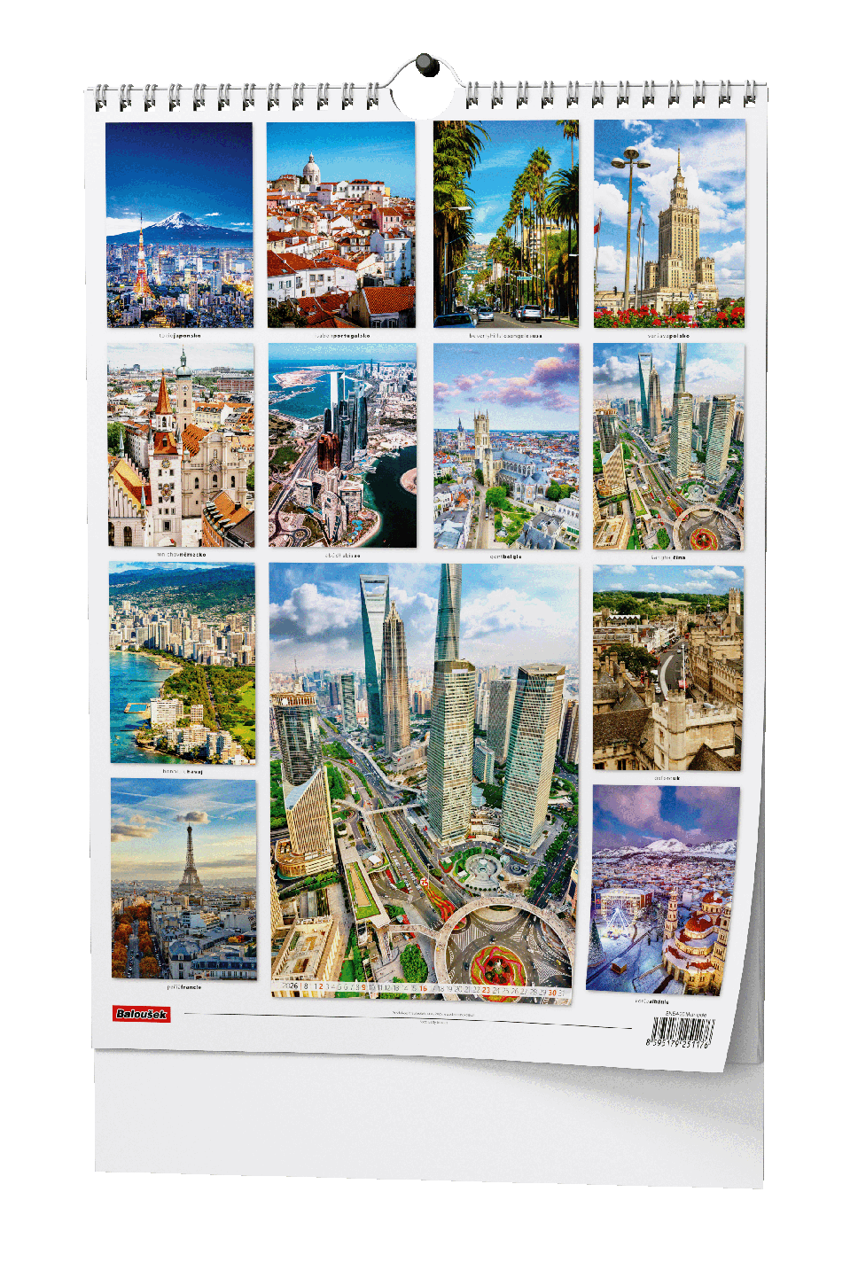 Nástěnný kalendář s krásnými obrázky světových metropolí v trendy stylu. 320x450 mm, 14 listů Papír: křída lesk, 135 g/m2 Obálka: křída lesk 150 g/m2 Karton je z kvalitní bílé lepenky Dvojitá kovová spirála "twin wire" po celé šířce kalendáře s háčkem pro zavěšení Baleno v průhledném sáčku s průhmatem.