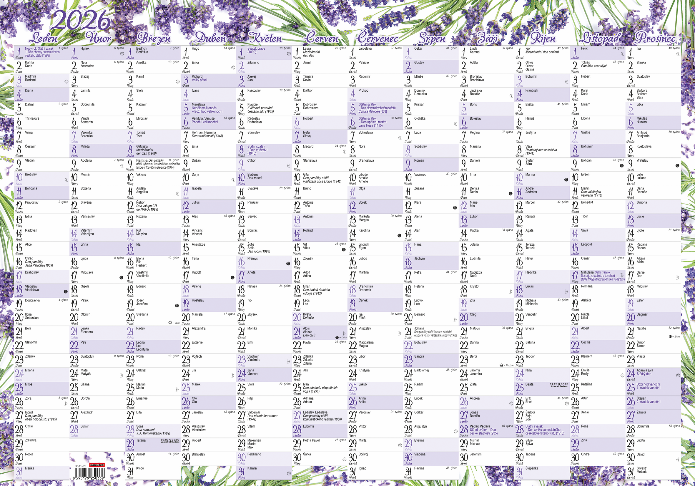 Nástěnný roční kalendář - Levandule v praktické velikosti 60 x 42 cm. České jmenné kalendárium. Pověste si ho na lednici nebo na skříň a prostě plánujte. Papír: křída lesk, 150g/m2. Složeno na formát A4 , baleno po 1 ks ve fólii