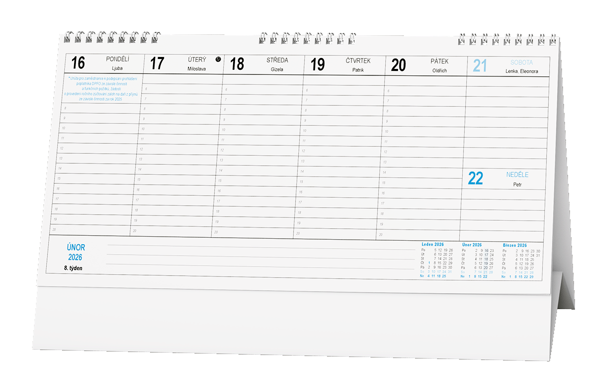 300x150mm, 57 stran, týdenní Oblíbený modrý kalendář s týdenním kalendáriem pro plánování Vašich daní. Kalendárium: české týdenní jmenné, měsíční fáze, roční období, letní a zimní čas, daňové termíny dělená kovová spirála "Twin Wire" Kalendář je tištěný na ofsetový papír v gramáži 70 g/m2. Obálka je tištěna na kvalitní křídový papír a je povrchově upravena UV-lakem proti otěru. Kartonový stojánek je vyroben z kvalitní bílé lepenky v gramáži 600 g/m2. Možnost reklamního přítisku - výška pro přítisk je 35 mm.