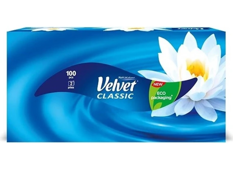 Hygienické kapesníčky Velvet jsou výjimečně měkké a jemné. Vyrobeny ze 100% celulózy, 2-vrstvé, 100 ks v krabičce.