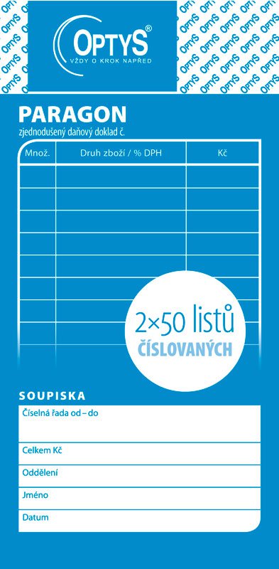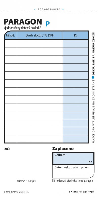 Obchodní paragon - zjednodušený daňový doklad tiskopis je dle nové legislativy přizpůsoben pro 3. daň z přidané hodnoty, došlo tedy k rozšíření kolonek nepropisovací číslovaný formát 7,5 x 15 cm na výšku obsahuje 2 x 50 listů odtržitelných perforací