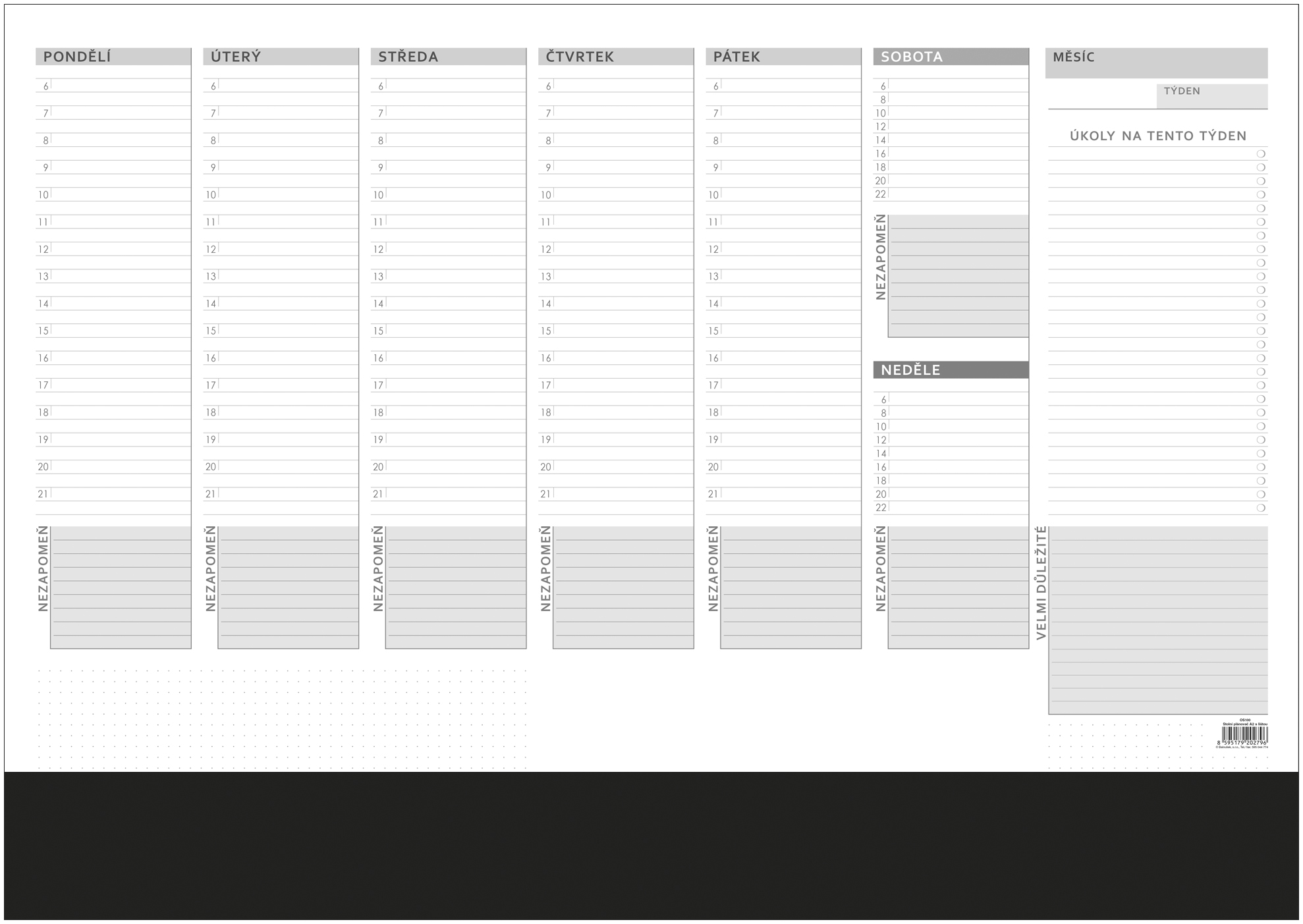 Stolní plánovač s týdenním rozvrhem a černou plastovou lištou. Formát A2 obsahuje 50 listů týdenních map a je opatřen 60 milimetrovou lištou pro zakládání dokumentů. Možno využít jako psací podložku na stůl.