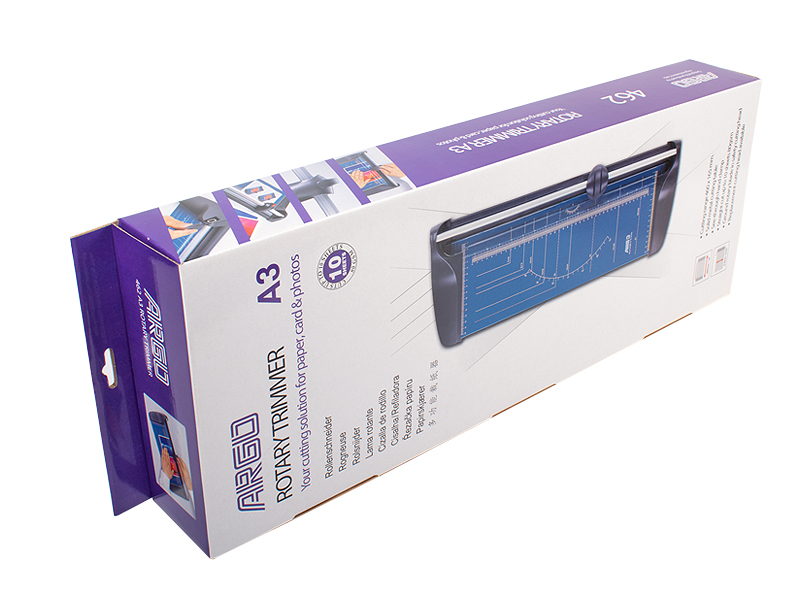 Kotoučová řezačka s broušeným kolečkem na profilované tyči s maximální délkou řezu 460 mm. Pracovní stůl je vybaven natištěnými měřítky a úhly. Nechybí přítlačná lišta z průhledného plastu. Řezačka díky své konstrukci uřízne bez problémů 10 listů papíru.