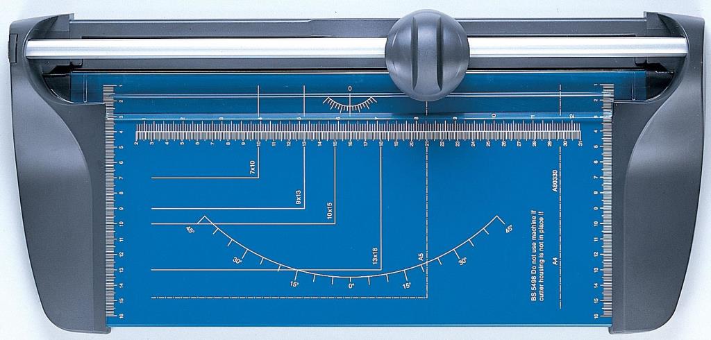 Kotoučová řezačka s broušeným kolečkem na profilované tyči s maximální délkou řezu 330 mm. Pracovní stůl je vybaven natištěnými měřítky a úhly. Nechybí přítlačná lišta z průhledného plastu. Řezačka díky své konstrukci uřízne bez problémů 10 listů papíru 70g/m2.