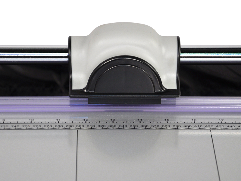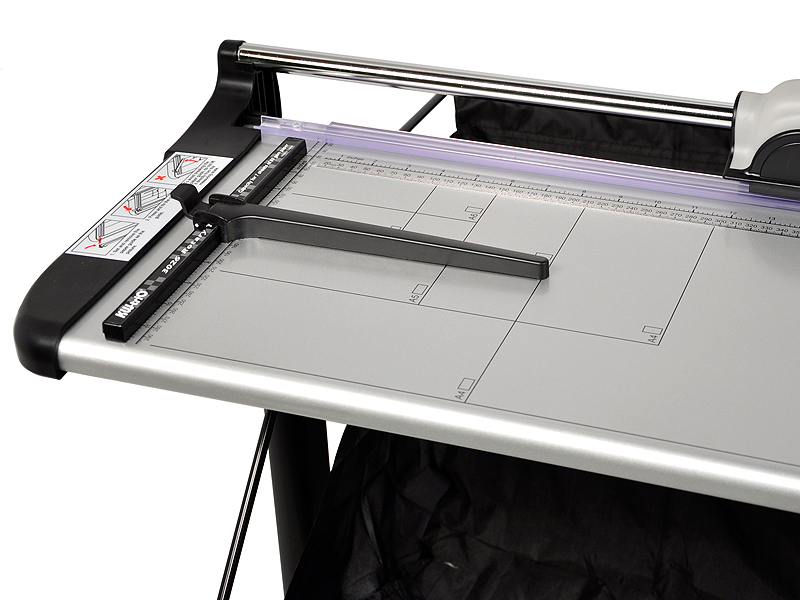 Kvalitní kolečková řezačka s pevnou kovovou základnou a řeznou hlavou umístěnou na kovové tyči. Pracovní stůl je vybaven natištěnými měřítky a posuvnou zarážkou souběžnou s přímkou řezu. Rotační nůž z nerezové tvrzené oceli. Stůl v ceně.