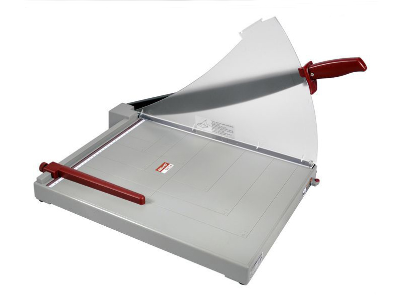 Hobby páková řezačka A3 s plastovým ochranným krytem a plastovou základnou s oděruvzdorným povrchem ABS, vyznačenými měřítky a DIN formáty a posuvným dorazem papíru se šroubovou aretací.