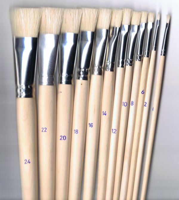 Ploché školní štětce s bílými štětinami,nelakovanou přírodní rukojetí a bezešvým hliníkovým kováním.