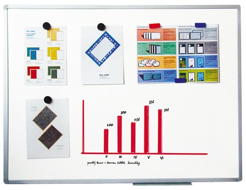 Magnetická tabule v hliníkovém rámu, lakovaný povrch, popisovatelná zasucha stíratelnými značkovači. Odkládací lišta a sada pro montáž na zeď.