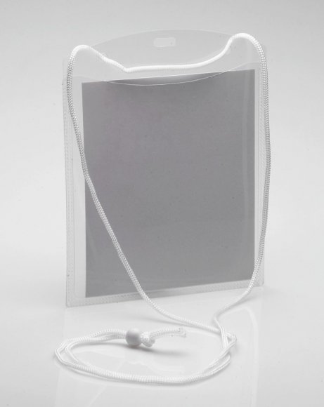 Visačka měkká průhledná z polyprophylenu včetně šňůrky na krk. Uvnitř s kartonem 97×110 mm. Velikost kapsy:114×137 mm, šňůrka bílá, tenká, kulatá, délka 90 cm.