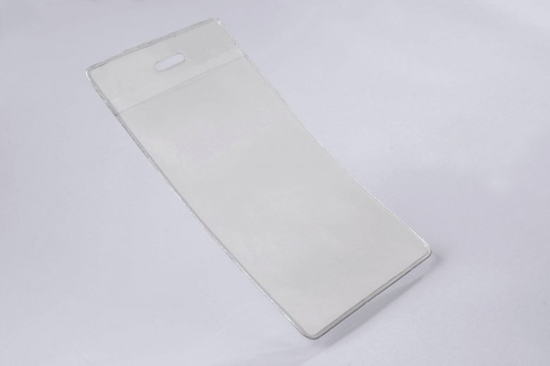 Čirá visačka z měkčeného PVC – svislá, vnitřní rozměr 58×90 mm. Možno zavěsit na klips, šňůrku nebo řetízek.